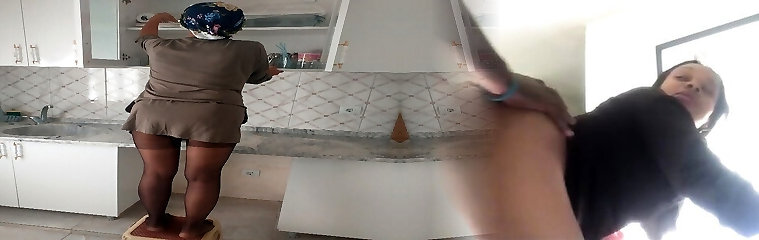 A scorching housewife in the kitchen flirts merrily flashing her attractive ass and not young innate movable boobs that hang a