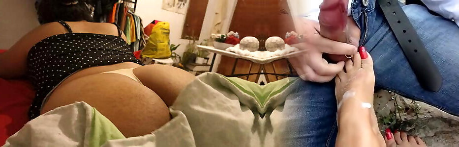 Dry fucking camel toe in missionary pose till he cum in clothes, polishing on her opened up legs makes him cum in his pa